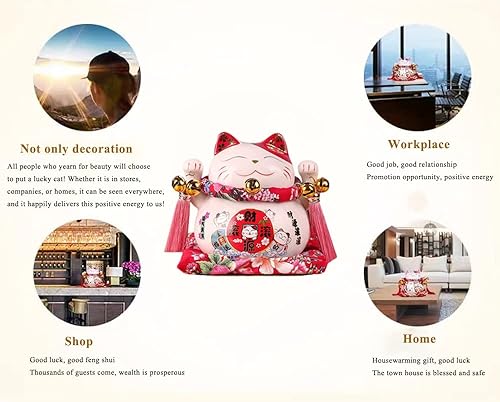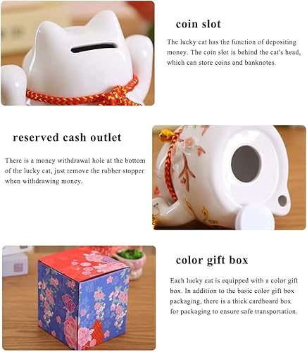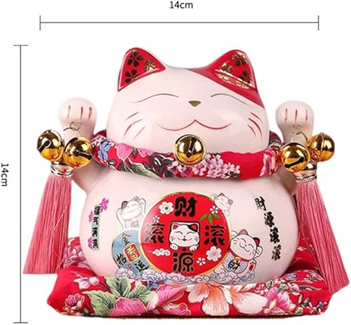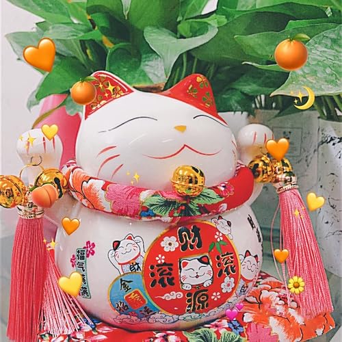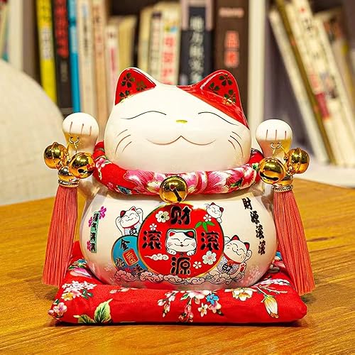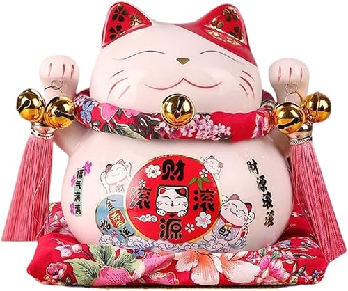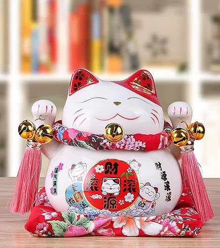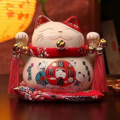 Maneki Neko Tirelire - Tirelire Chat Japonais Porte Bonheur, Statue de Chat Japonais en Porcelaine avec Pompon de Style Chinois et Cloche Porte-Bonheur pour la décoration de Bureau(Blanc)