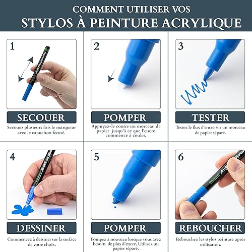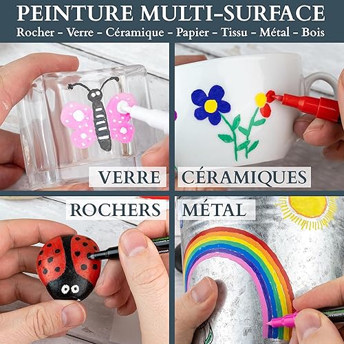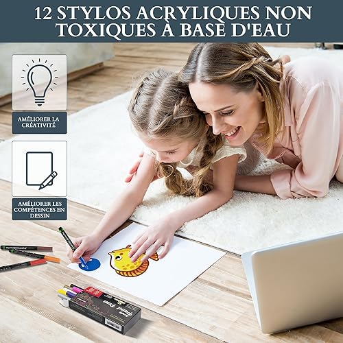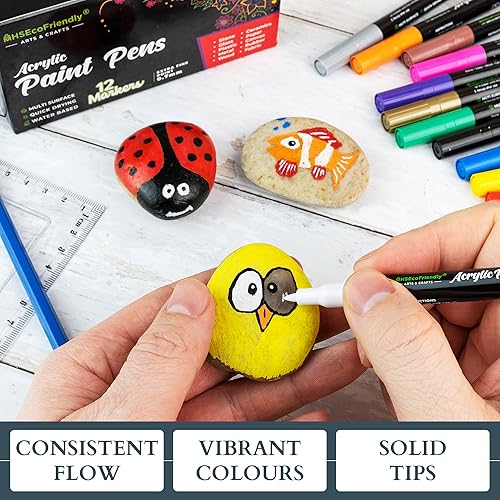 MHSEcoFriendly Lot de 12 stylos de peinture acrylique à pointe fine de 0,7 mm | Non toxiques et imperméables | Stylos pour peinture sur roche, pierre, galets, verre, céramique, bois et tissu |