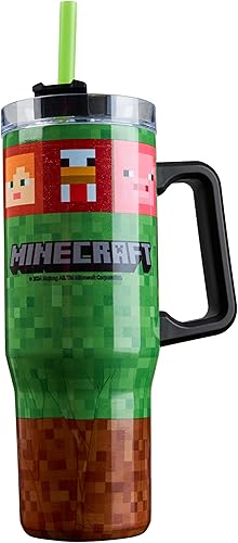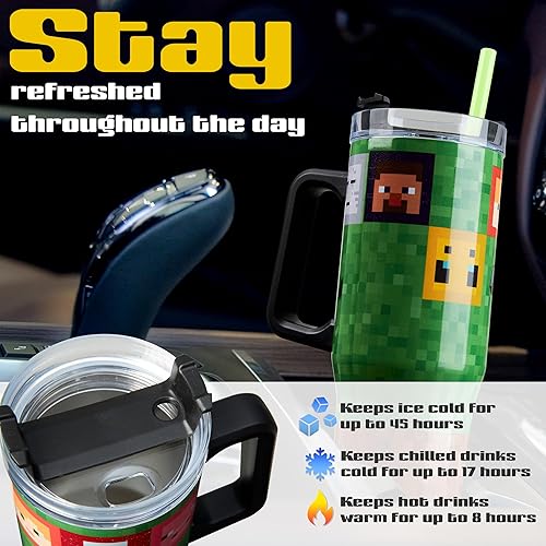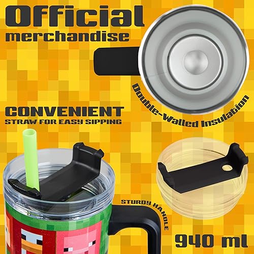 Minecraft Gobelet Isotherme avec Paille et Couvercle 940ml, Double Paroi Mug Isotherme avec Poignée, Froide 17H, Chaude 8H, Glace 45H