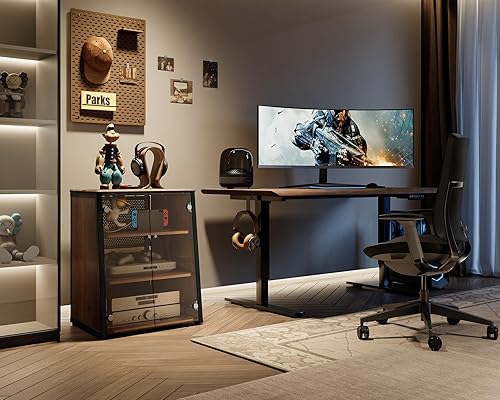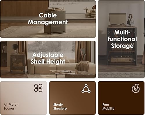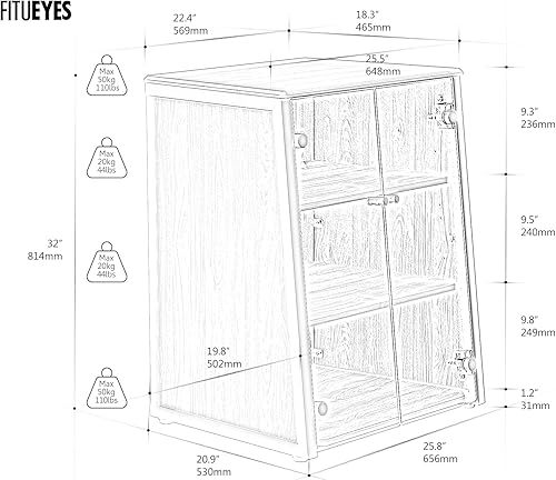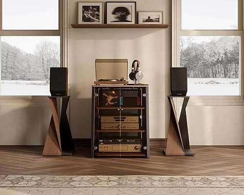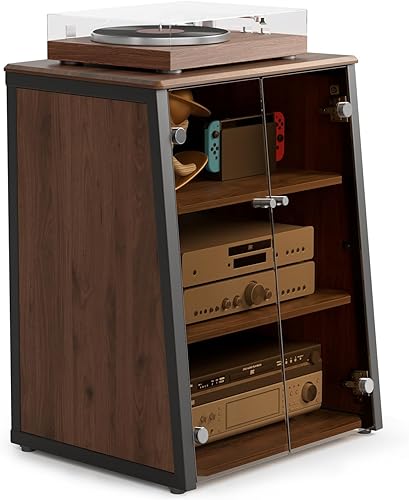 FITUEYES Design Meuble HiFi à 4 Etagères avec Portes en Verre Stockage Réglable Meuble Vinyle Grille Ventilée 66×65×81cm