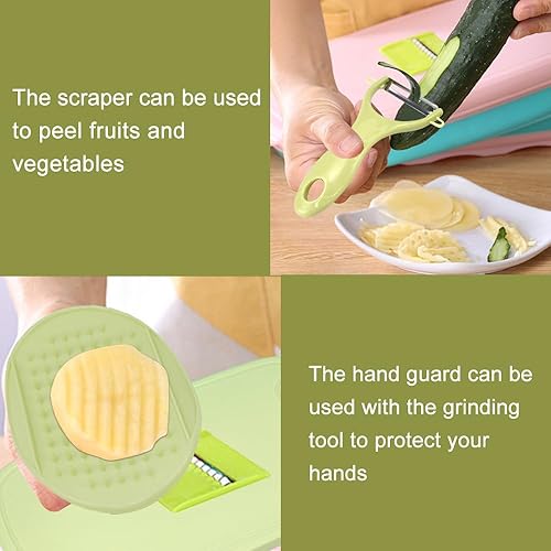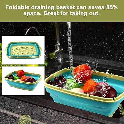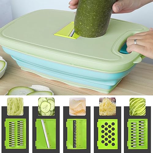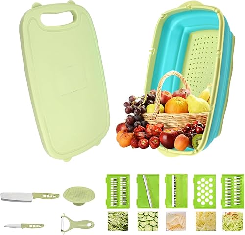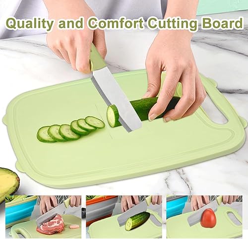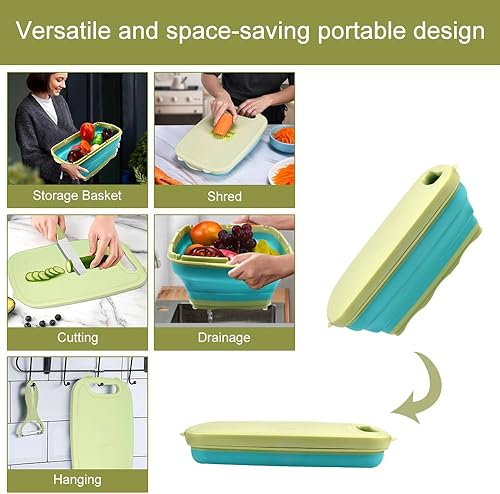 EMAGEREN Planche a Decouper Pliable, 11 in 1 Planche a Decouper Camping Bassine Pliable Camping Multifonction Panier de Drainage avec 5 Trancheuses Différentes et 2 Couteaux pour Les Cuisines Voyages