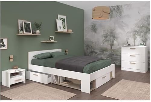 Parisot Chambre Complete Adulte Dream : Lit 140x190/200 cm + 2 chevets + Commode - Décor Blanc et Chene