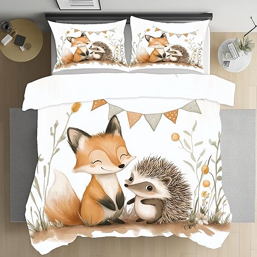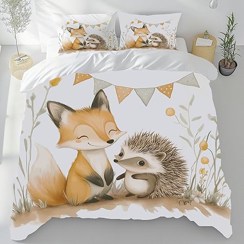 RRUxiia Housse de Couette Hérisson Renard De Dessin Animé, Parure de Lit Réversible 90x190 cm, Animal Mignon Housse Couette Installations De La Jungle 1 Personnes avec 1 Taies d'oreiller 65x65 cm