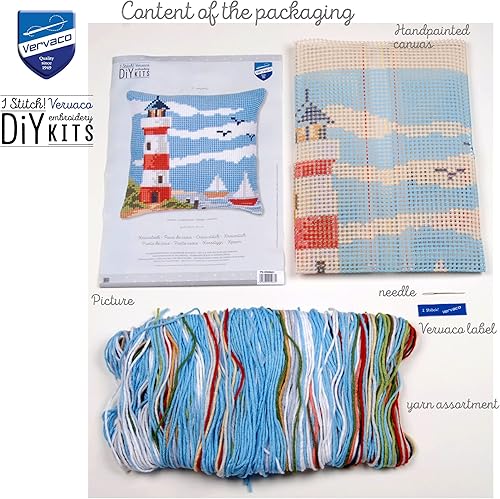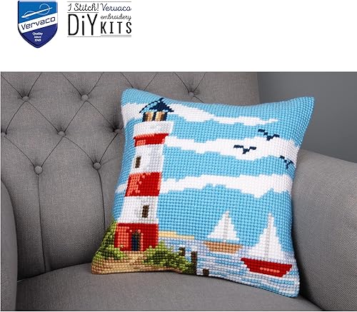Vervaco Point De Croix Kit Coussin Complet Set LA PLAGE AU PHARE Decoration Manuelle Broderie Kit Adulte Art Creatif Cadeau DIY Cross Stitch Embroidery ca. 40 x 40 cm
