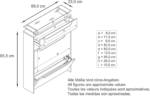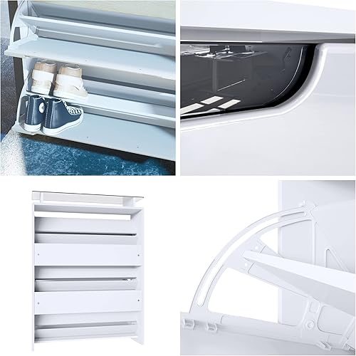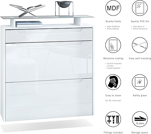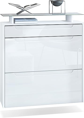 Vladon Meuble Chaussures Annie pour 16 Paires de Chaussures avec 2 clapets et 1 Tablette en Verre, Blanc Mat/Blanc Haute Brillance, poignées encastrées en Blanc Haute Brillance (89 x 96 x 23 cm)