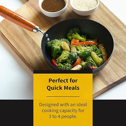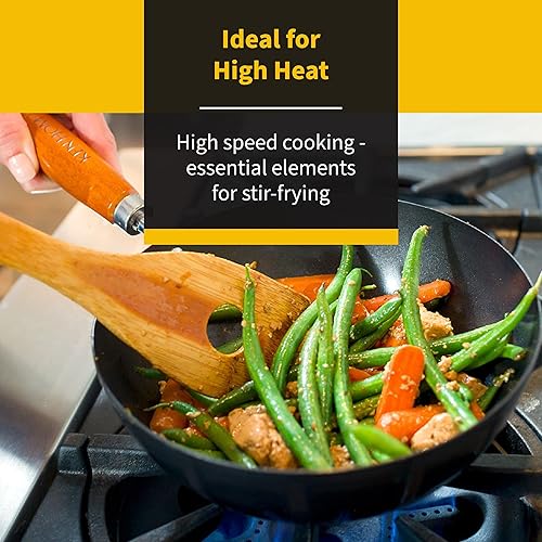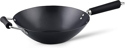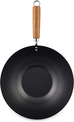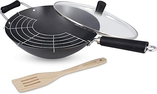 Ken Hom Ensemble de Wok Acier au Carbone, 31cm, Excellence, Set de 4 Pièces/Poele Wok Induction avec Couvercle en Verre, Grile Spatule en Bois, Passe au lave-vaisselle, Garantie de 2 ans, KH431041