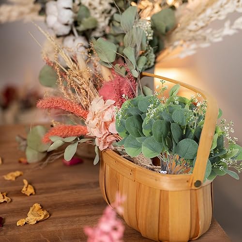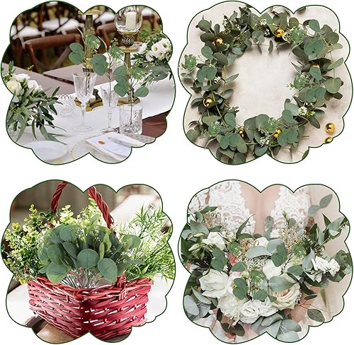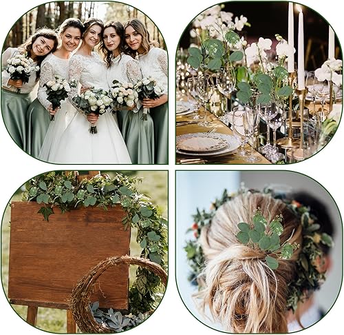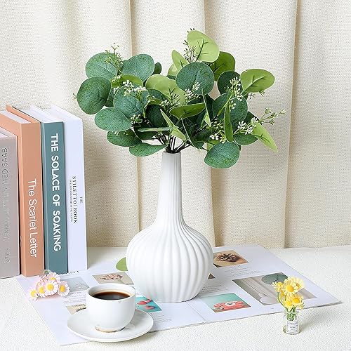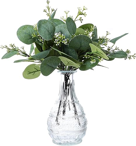 KALIONE Lot de 12 feuilles d'eucalyptus artificielles en forme de dollar argenté, tiges et branches artificielles avec graines blanches, 29 cm de long, plantes vertes décoratives pour bouquets