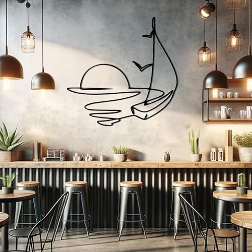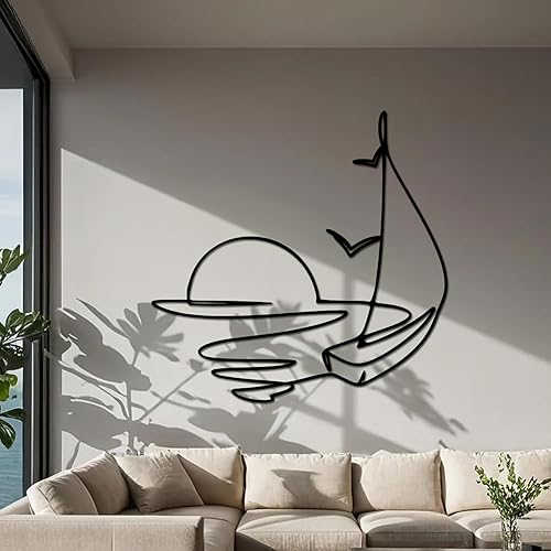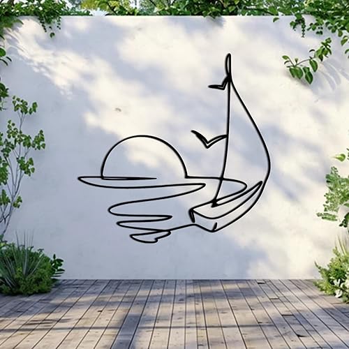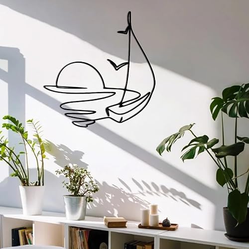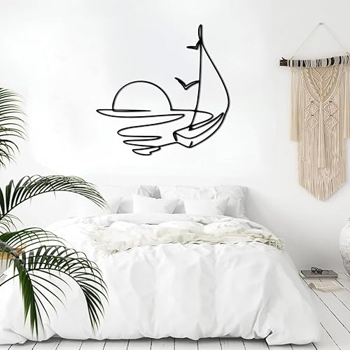 Art Mural en métal, décoration Murale de Maison en Bateau Soleil et Voile, Sculpture Murale de mer Nautique Minimaliste for Chambre à Coucher, Salle de Bain, Salon
