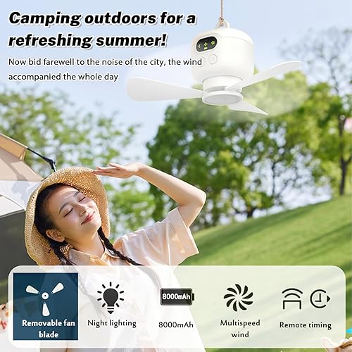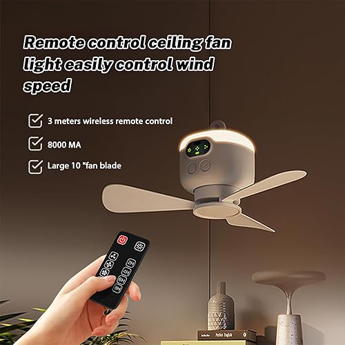 Kouamor Mini ventilateur de plafond rechargeable USB de 26,9 cm 4 W, 3 vitesses, mini ventilateur de plafond USB, ventilateur de plafond avec veilleuses et télécommande, pour tente, randonnée, camping