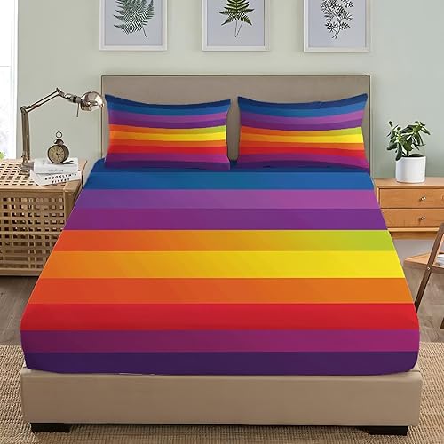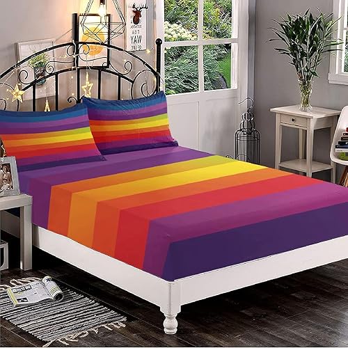 Drap Housse 160x200x30cm Bonnet 30cm Motif à Rayures Arc-en-Ciel Drap-Housse pour 2 Personnes lit, Microfibre Confortable et Respirant Housse Matelas, Coloré Drap de Fond Hypoallergénique