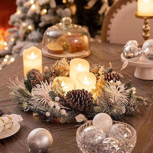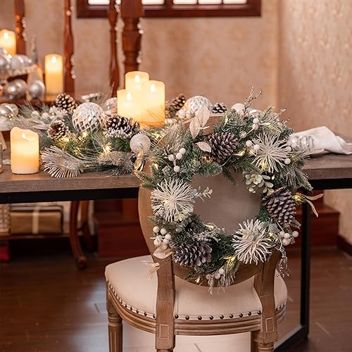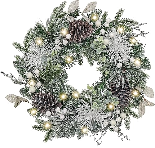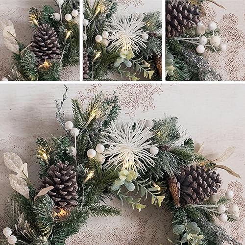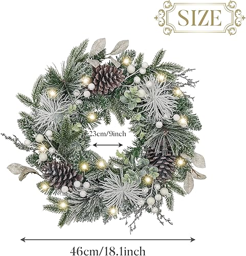 Valery Madelyn 46 cm Couronne de Noël Artificielle pour la Porte d'Entrée avec Pomme de Pin et des Boules de Noël, Couronne Artificielle avec des lumières LED et Fonction de minuterie pour Noël