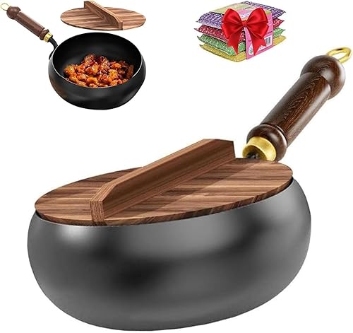 CAIWEIJUN Biennll Poêle japonaise en fer forgé avec couvercle en bois, 24 cm/28 cm, poêle en fer forgé à la main antiadhésive avec fonction de réchauffement, pour cuisinière à induction et gaz