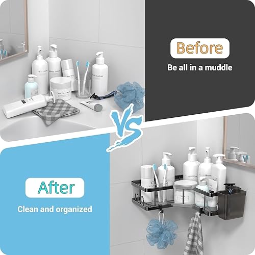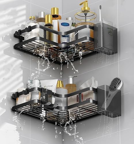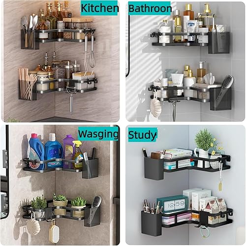 VILCEN Étagère de Douche sans Percage, Etagere Salle Angle de Bain, Rangement Douche pour Nettoyant pour Corps de Shampoing, 4 pièces Etagère Douche Angle, Noir