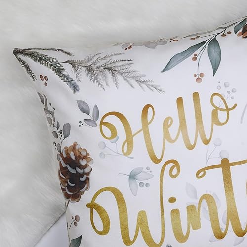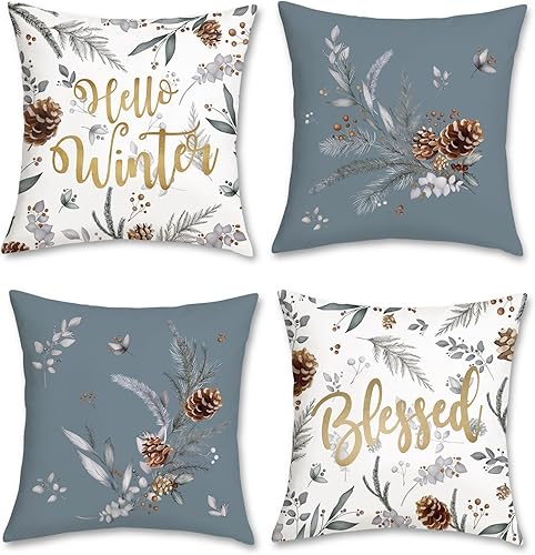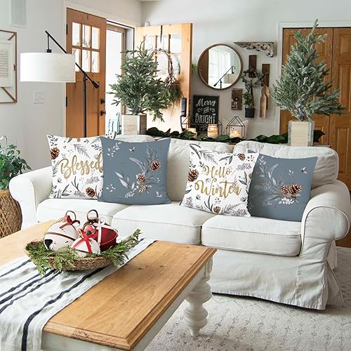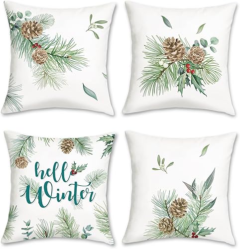 Bonhause Housse de Coussin Hiver Gris 45 x 45 cm Feuilles Pommes de Pin Gris Velours Doux Décoratif Taie d'oreiller pour Canapé Salon Chambre Jardin Maison Hiver Décoration 4 Pièces