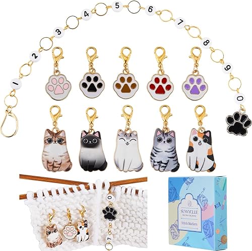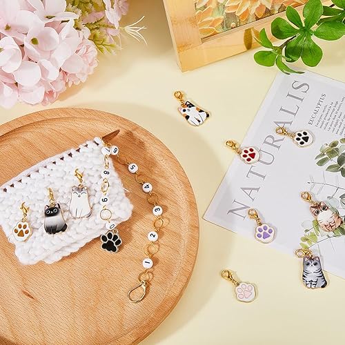 SUNNYCLUE 11 pièces Marqueurs de Point Chat Marqueurs de Crochet Mignon Empreinte de Patte Breloques en Émail Or Tricot Rangée Compteur Chaînes Fermoir Mousqueton Verrouillage Marqueur de Point en Mét
