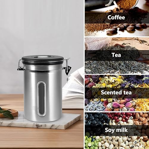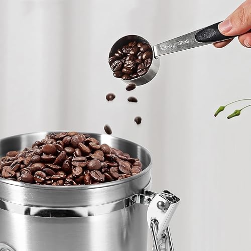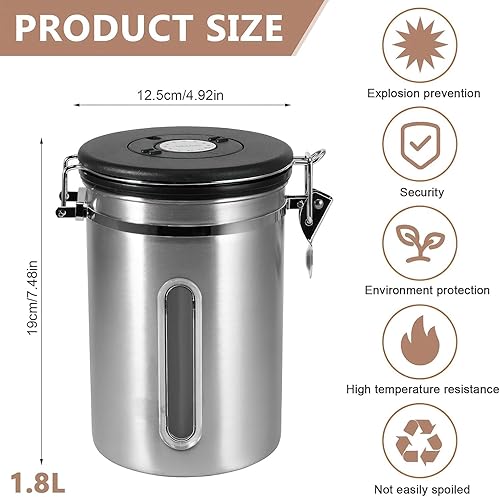 ZONJIE Boîte à café hermétique - 1,8 l - En acier inoxydable - 1 kg - Avec cuillère doseuse, valve CO2 et date - Pour café moulu et grains de café moulu - Argenté