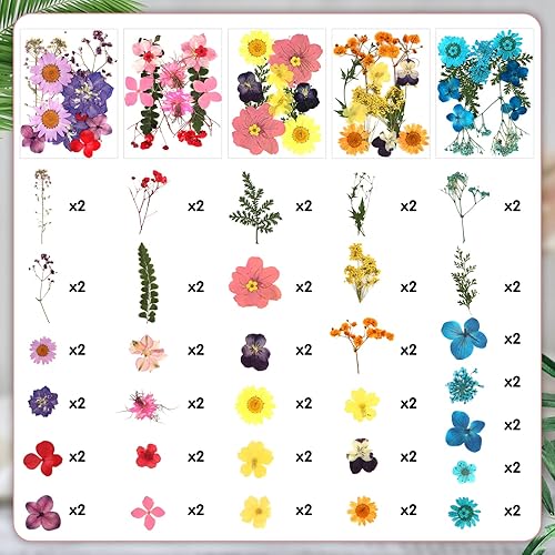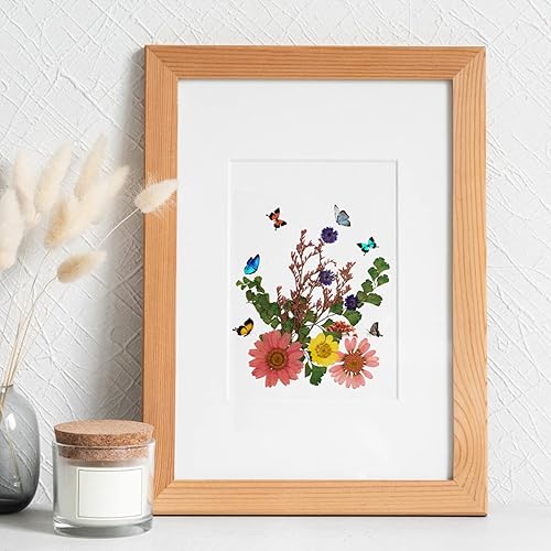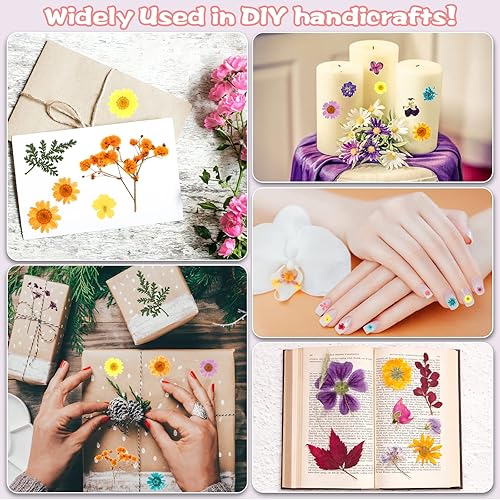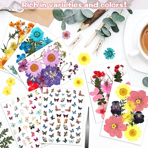 62 Pcs Ensemble de Fleurs Séchées Pressées Vraies Fleurs Séchées Naturelles Multicolores Feuilles Séchées Mélangées pour Bougie Résine Maquillage Bricolage Artisanat avec Autocollants Papillons