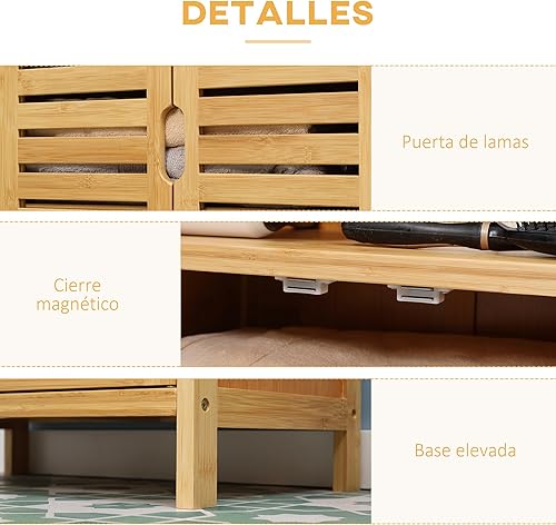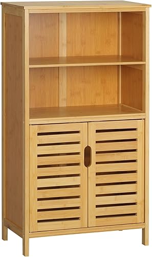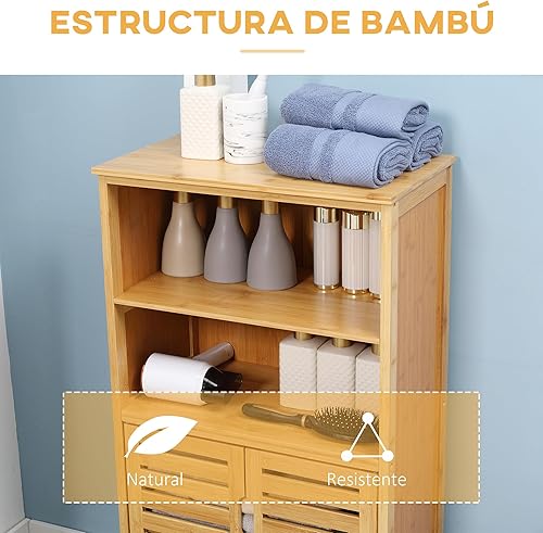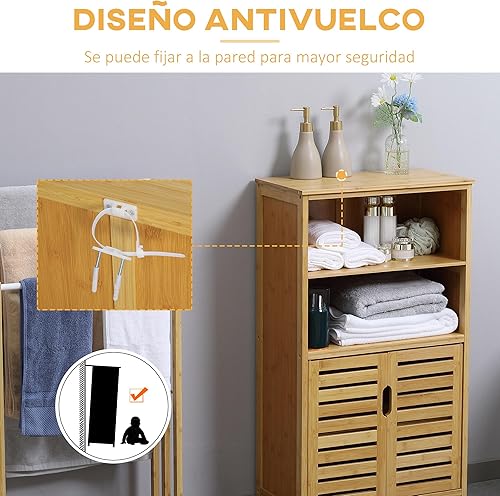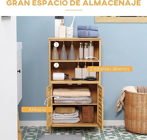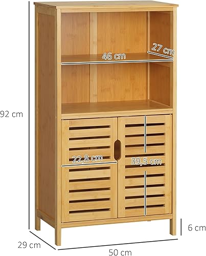 kleankin Mueble de Baño de Bambú Armario de Baño Con 2 Puertas 2 Estantes Abiertos y Patas Elevadas Antivuelco 50x29x92 cm Natural