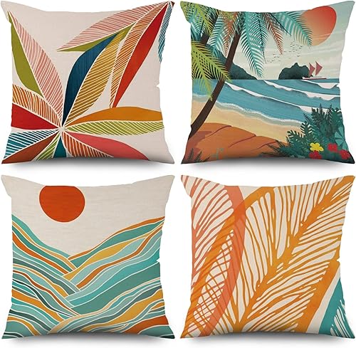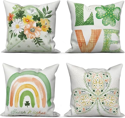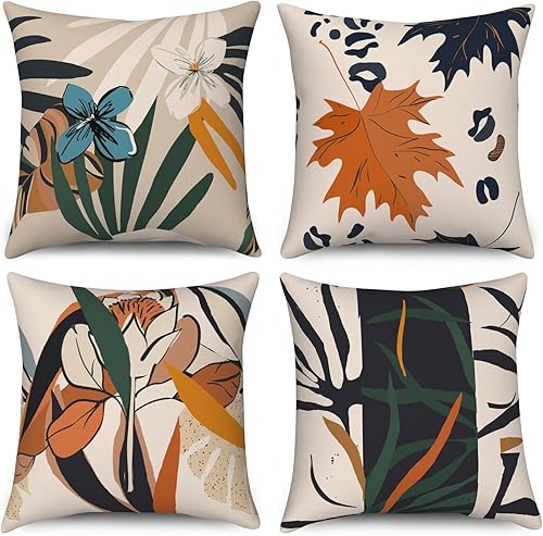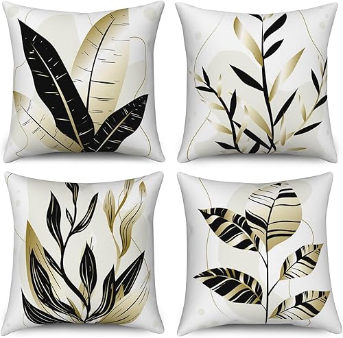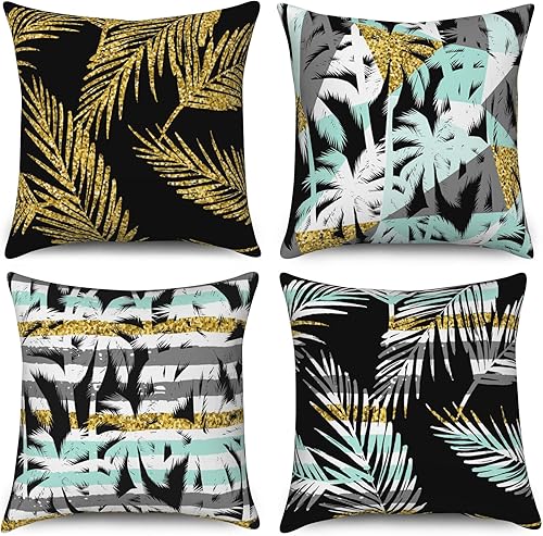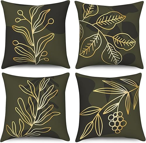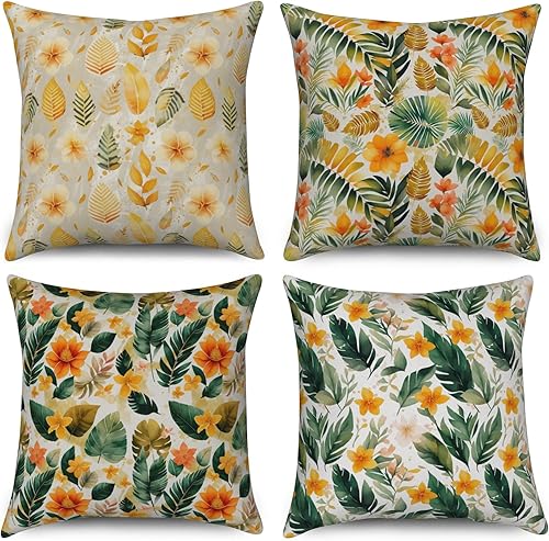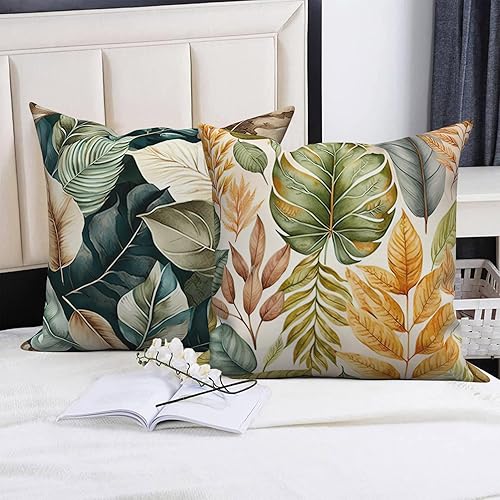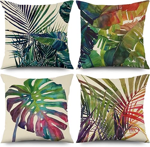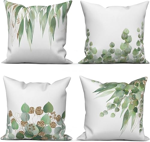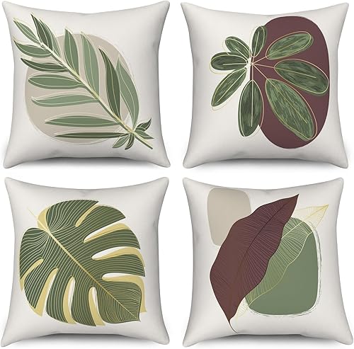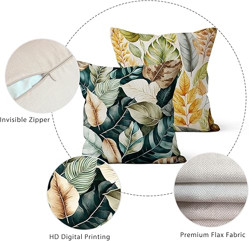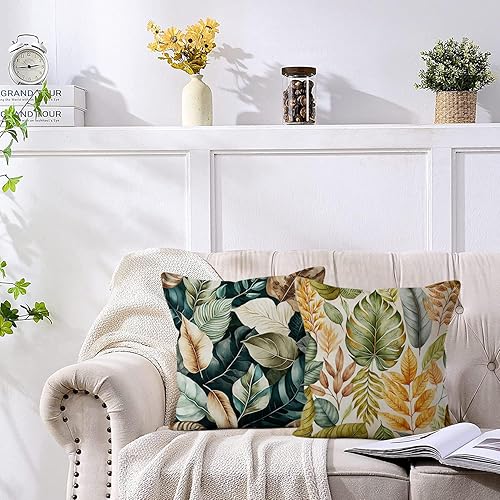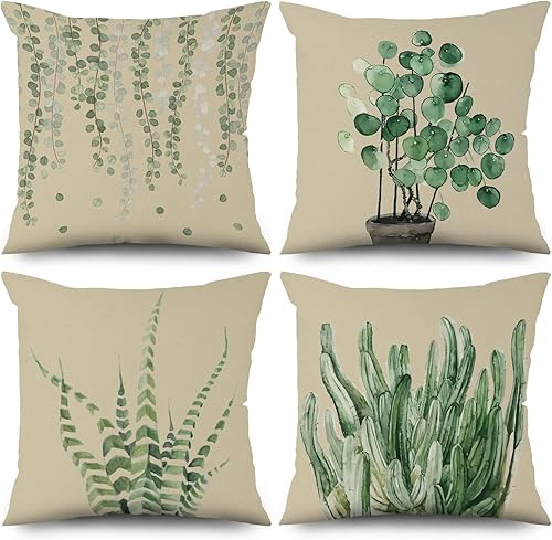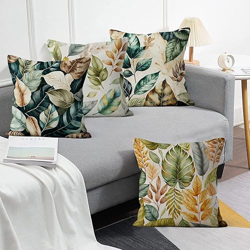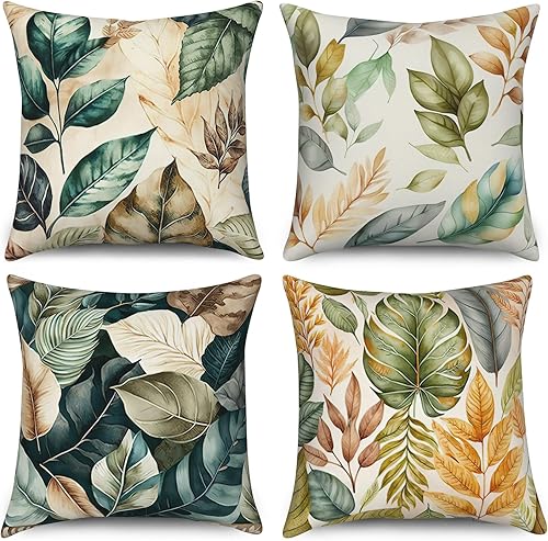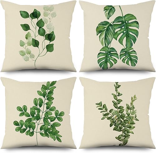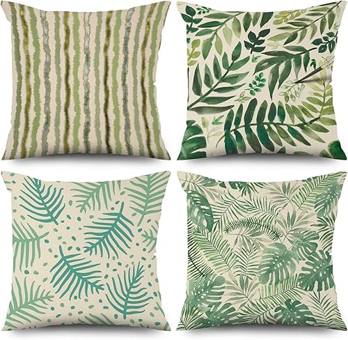 ASDCXZ Housse de Coussin Verte 40x40 cm, Lot de 4 décoratives pour canapé Printemps Aquarelle Feuilles Vertes Lavable Lin Textile d'extérieur Housse de Coussin