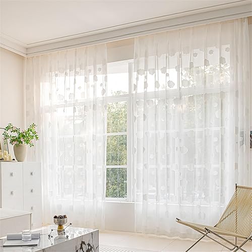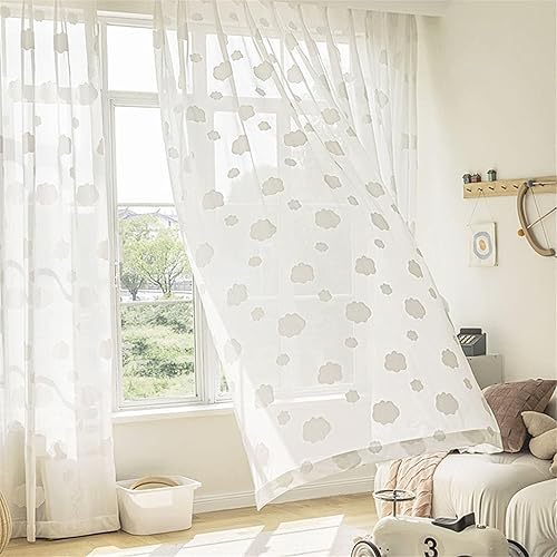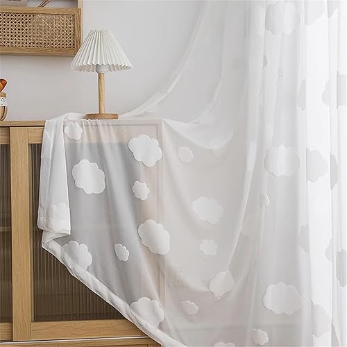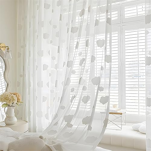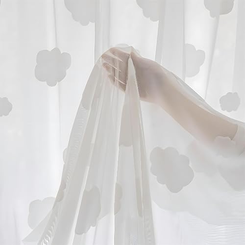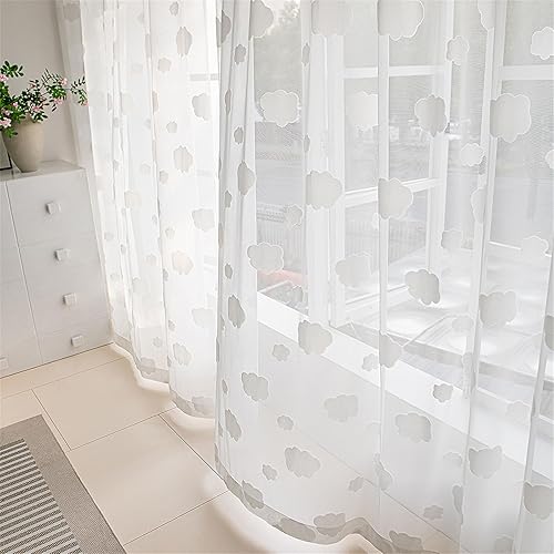 Odot Rideau Voilage Semi Occultant Salon, Jacquard Nuages Blanc Rideaux Voilages Passe Tringle Rideaux Voile Semi Transparent 2 Panneaux Rideau Occultant Fenêtre pour Chambre Intérieur (132x45cm)