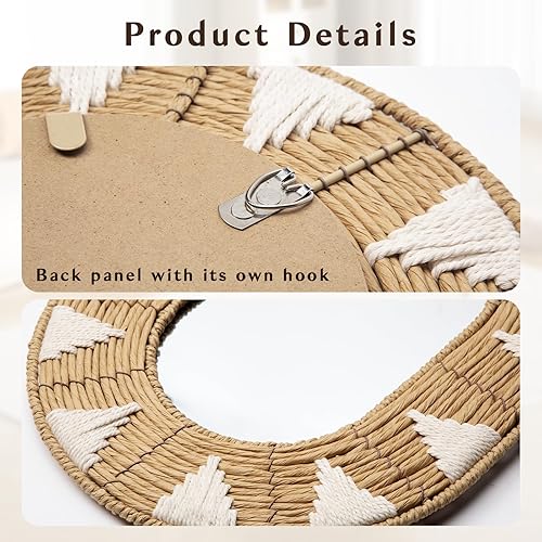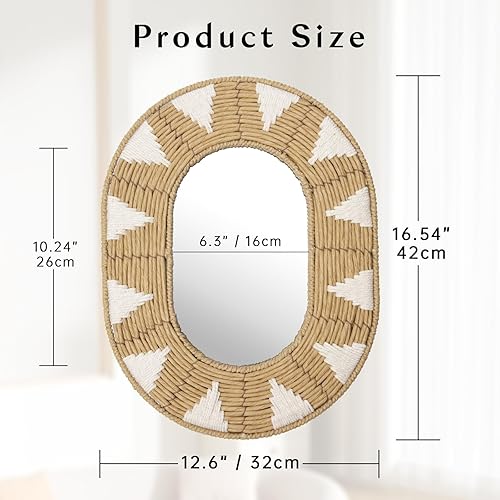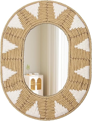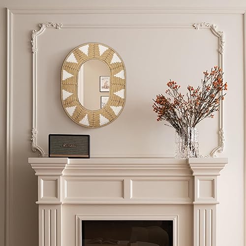 Oairse Miroir mural ovale en rotin - Style bohème - Moderne - Avec crochet en métal - Décoration murale bohème - Décoration murale - Pour salle de bain, entrée, salon, chambre à coucher