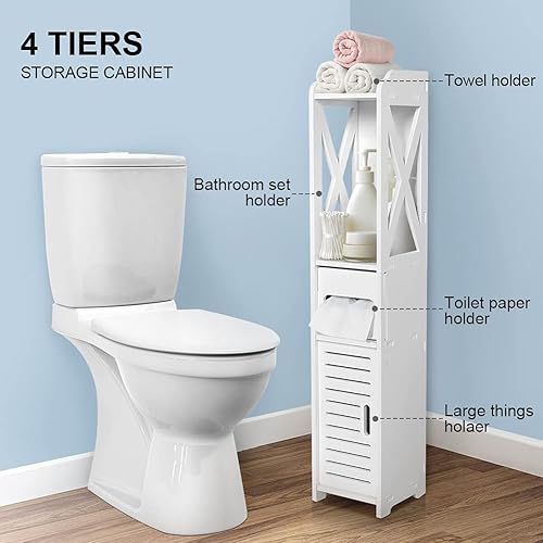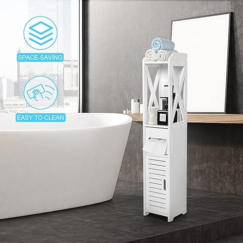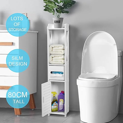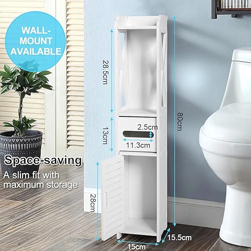 GOTOTOP Meuble Colonne Salle de Bain en Bois Blanc Armoire de Rangement Moderne Armoire de Toilette avec 2 Etagères, 1 Tiroir et 1 Porte 80×15.5×15 CM