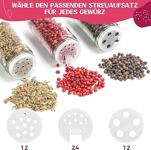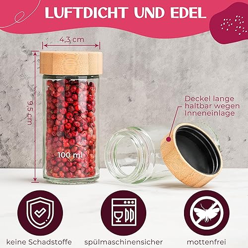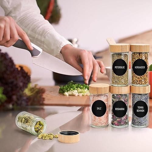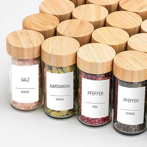 Happy Lemuro Lot de 24 Pots à Épices Ronds [12 x 100 ml] Avec 399 Étiquettes, Couvercles en Bambou | Récipient Avec Couvercles en Bois et Nombreux Accessoires