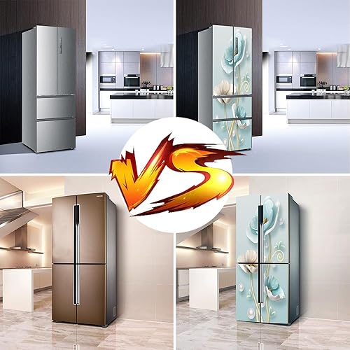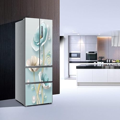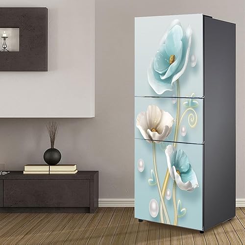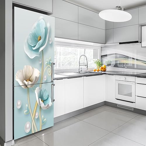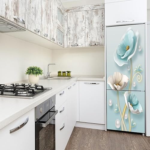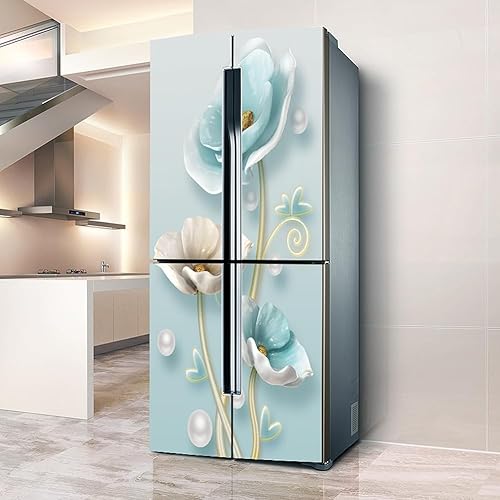 Stickers autocollants pour frigo, autocollant de réfrigérateur couvrant entièrement la porte du réfrigérateur, autocollants muraux pour décalcomanie de cuisine, fleur blanche bleu glace