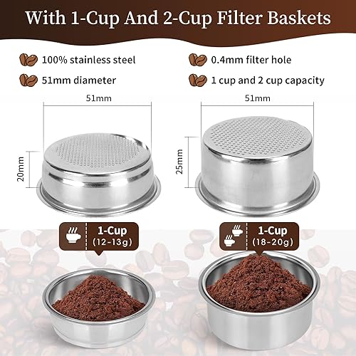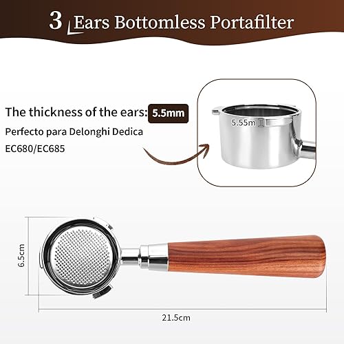 Porte Filtre 51mm pour Delonghi Dedica Ec680/Ec685, 3 Ears Porte-Filtre Sans Fond 51 Mm avec 2 Paniers Filtrants En Inox