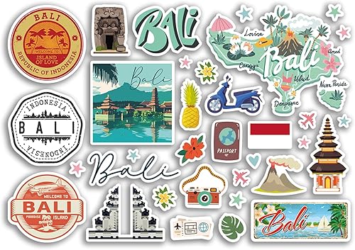 Feuille d'autocollants A5 en vinyle avec monuments de Bali – Indonésie, plage, mer, timbres, horizon, drapeau, voyage, carte de vacances, ville, scrapbooking, esthétique #80531