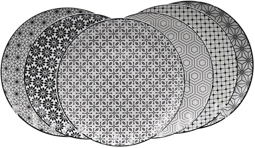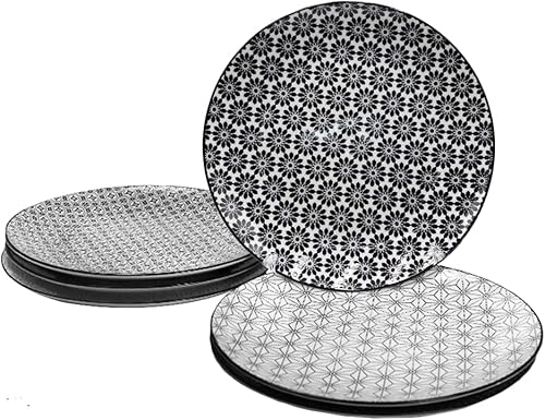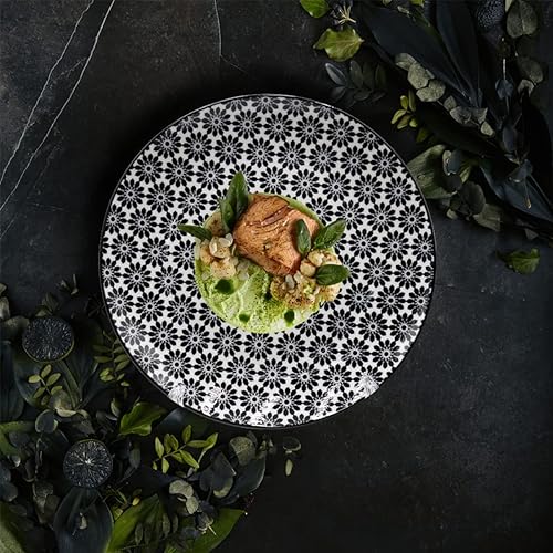 Ard'time - Lot de 6 Assiettes, Assiettes à Motifs, Assiettes Noires et Blanches, Vaisselle Chic, Assiettes Plates, Assiettes en Porcelaine, Design 2, Collection KOMAE