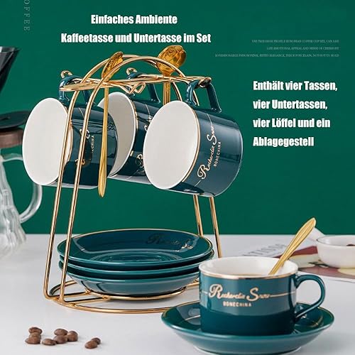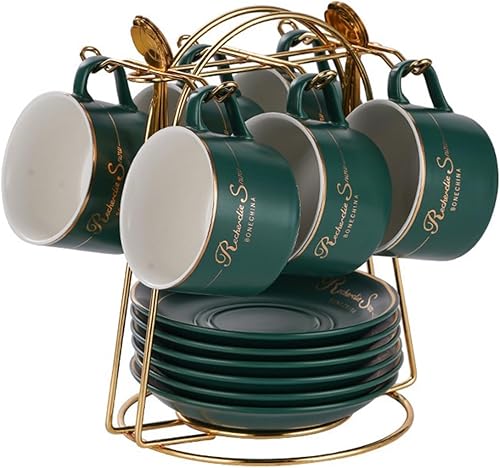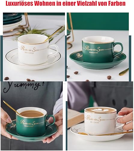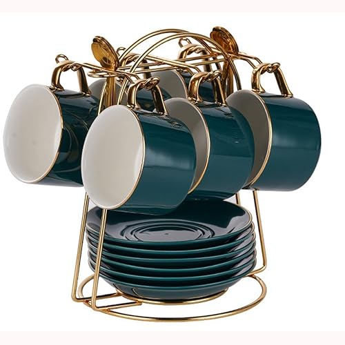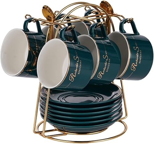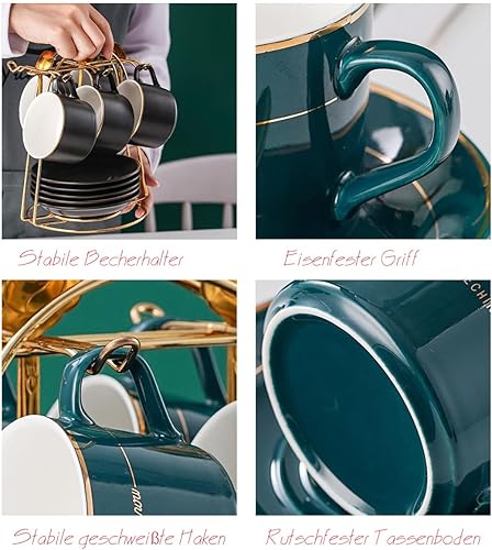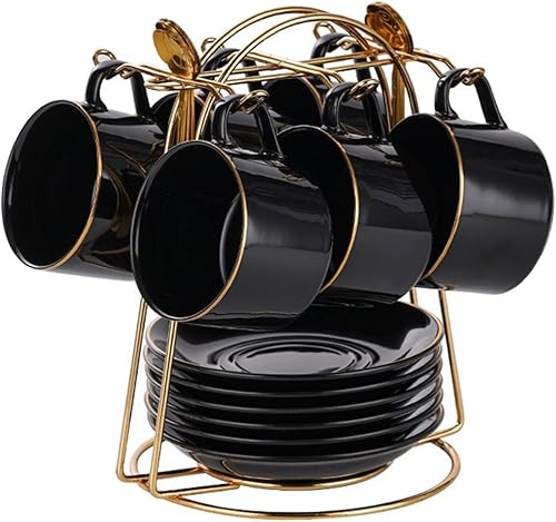 HSTWODE Lot de 6 tasses à cappuccino et soucoupes (150 ml), tasses à thé de luxe avec bordure dorée, tasse à café avec anse, en porcelaine royale britannique (noir brillant)