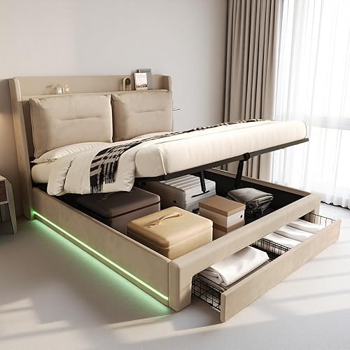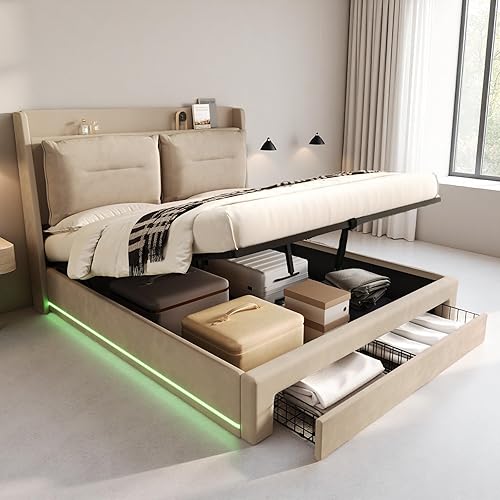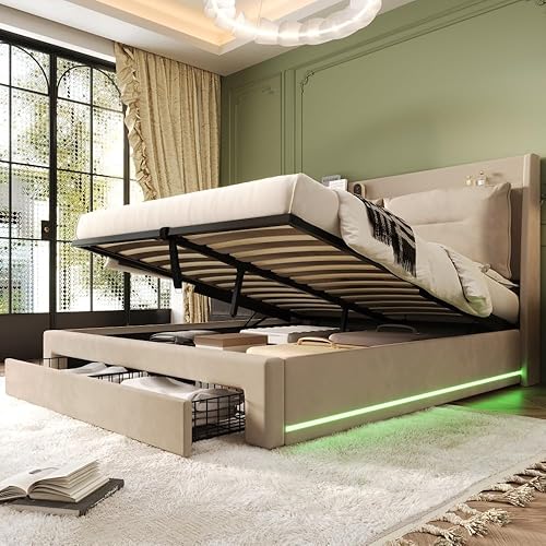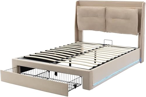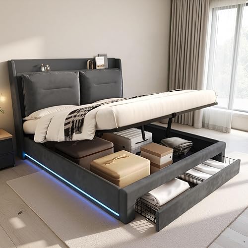 Zubaliya Lit Coffre 140x190 avec LED et tiroirs,Cadre de lit 140 x 190,lit 1 Personne avec Rangement et sommier à Lattes,sans Matelas,Velours