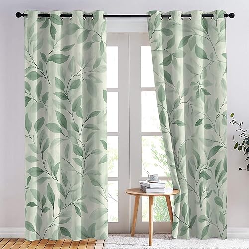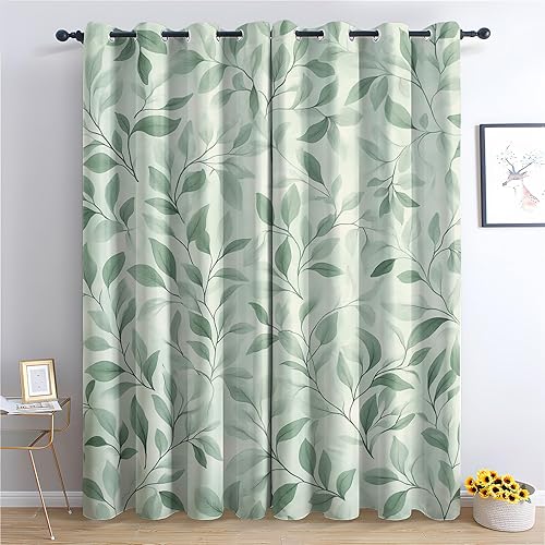 SZLYZM Rideaux Occultant Vert Sauge, Rideau Isolant Thermique pour Salon Chambre, Motif Feuille Verte, Lot de 2 Décoration de Fenêtre Opaque 140x160cm LxH, à Oeillets
