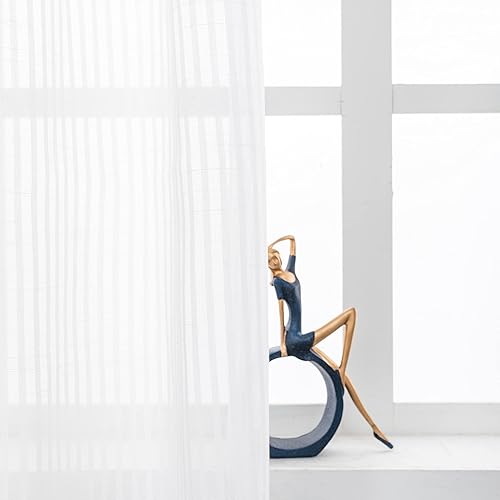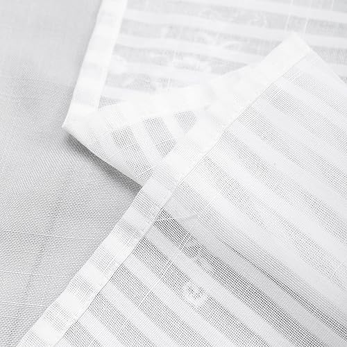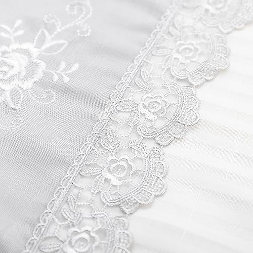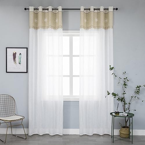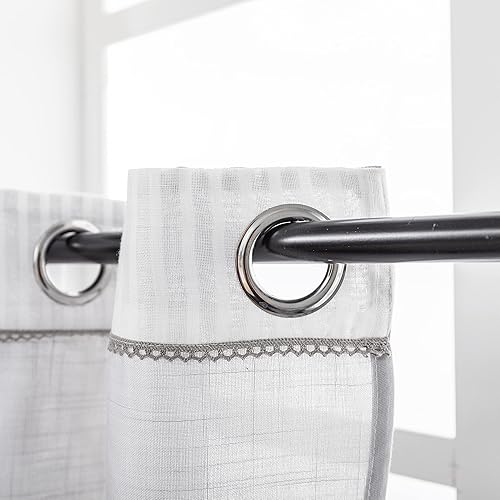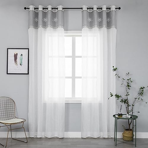GIRASOLE HOME Paire de rideaux blancs semi-transparents à rayures haut gamme avec broderie florale, mélange lin, style shabby chic, pour chambre coucher, 2 panneaux œillets (gris, 140 x 280 cm)