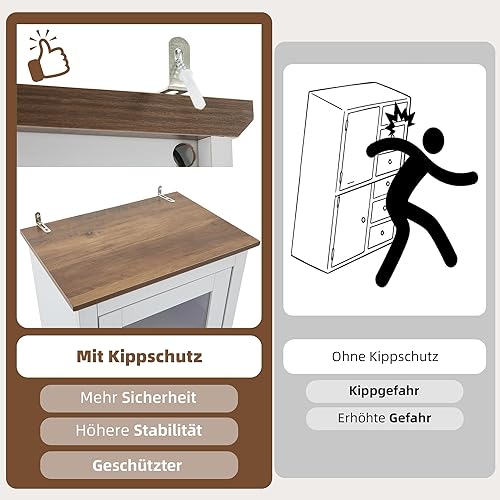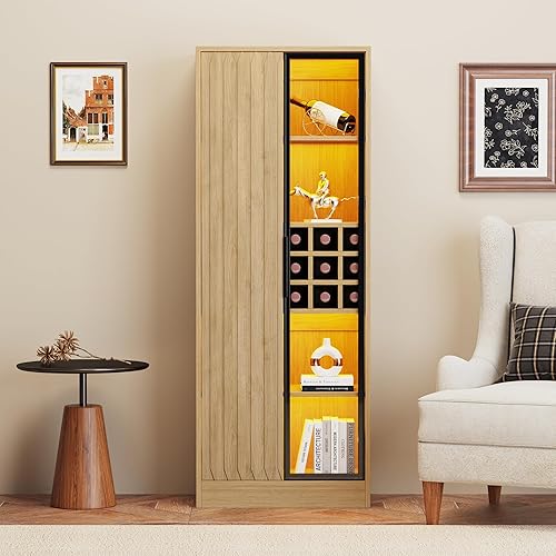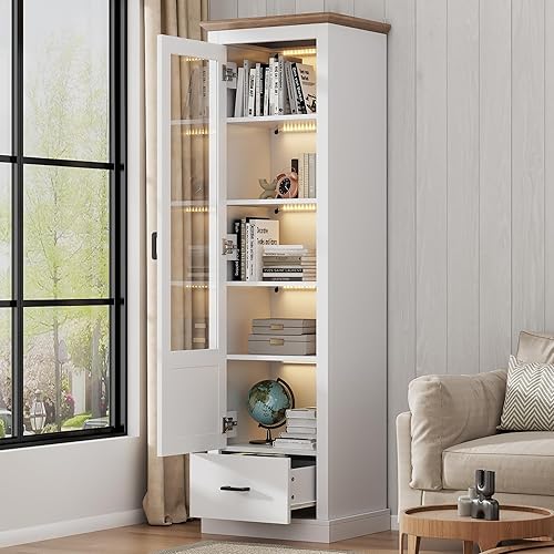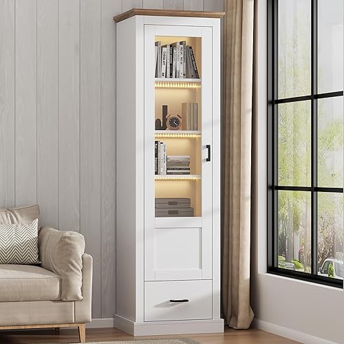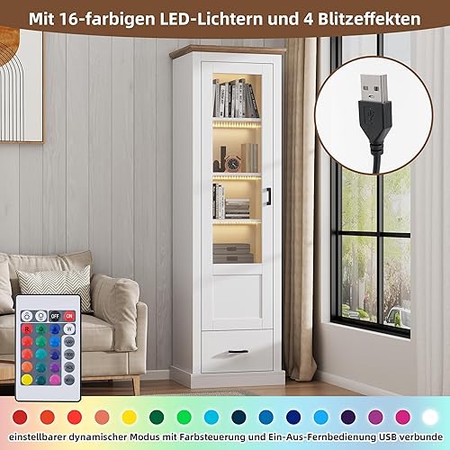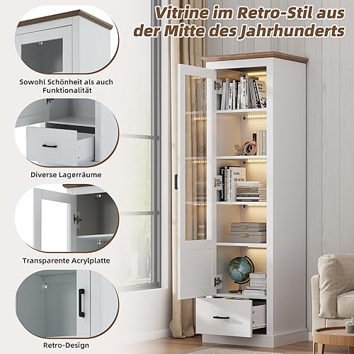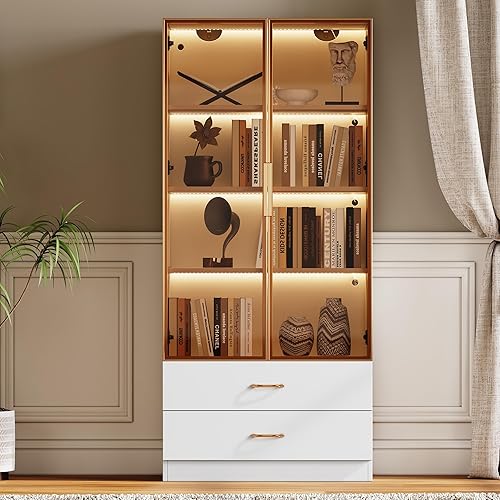 Merax Vitrine avec éclairage LED - Vitrine sur pied avec porte en verre - Rangement avec 2 tiroirs - Armoire polyvalente pour salon, bureau, cuisine, salle de bain - Naturelle - 75 x 34,5 x 170 cm