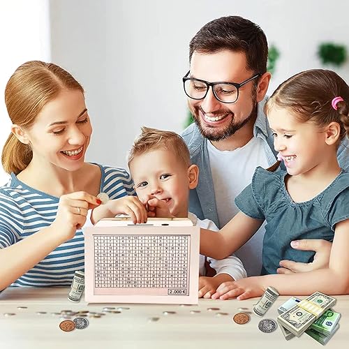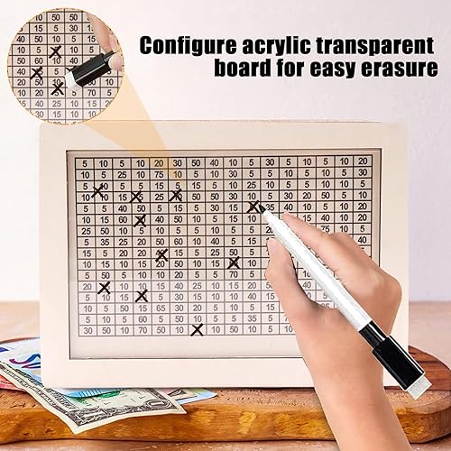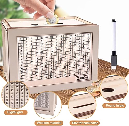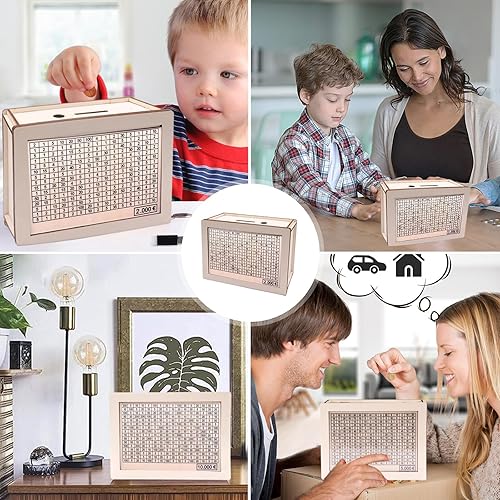 Tirelire en Bois, Tirelire Réutilisable avec Stylo Effaçable, Tirelire avec Objectif D'épargne et Chiffres à Cocher, Boîte Rangement Tirelire Rétro pour Aider Les Enfants à Commencer à Economiser
