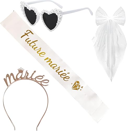 Accessoire EVJF Couronne Serre-tête Mariée+Echarpe Future Mariée+Voile avec Perles+Lunette Coeur Accessoire Kit Enterrement De Vie De Jeune Fille