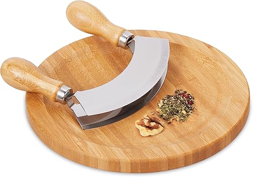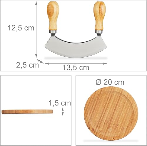 Relaxdays Hachoir Berceuse avec Planche, Bambou & Acier Inoxydable, Double Lame, diamètre de 20 cm, Nature - argenté