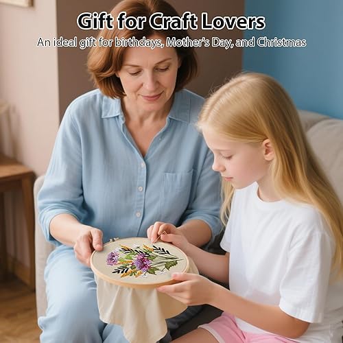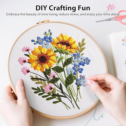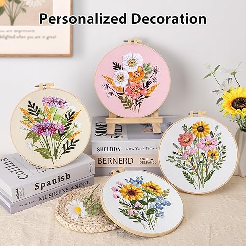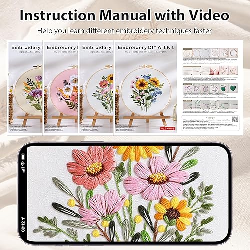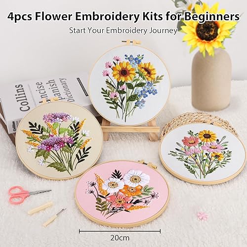 VynyQoo 4pcs Kit Broderie Debutant Motif Floral, Kit de Broderie fleurs, Fils à Broder Kit, Embroidery Kit Broderie Débutant avec Vidéo et Instructions, Kit de Broderie au Point de Croix pour Adultes