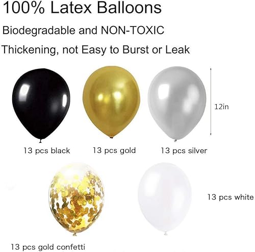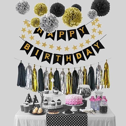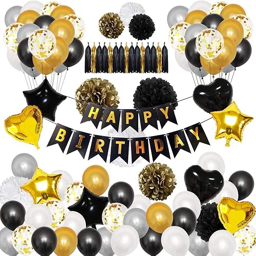 LAPONO Noir Or Décoration Anniversaire,décorations d'anniversaire 98 Pièces avec Joyeux Anniversaire Bannière Confettis Ballons en Latex étoile Coeur Ballons en Aluminium pour Fille Garçon