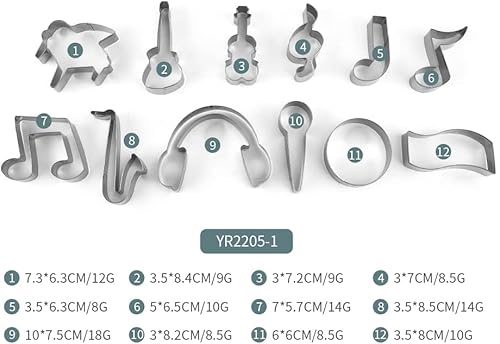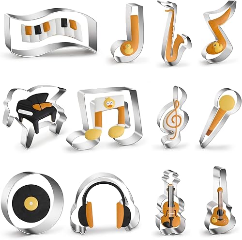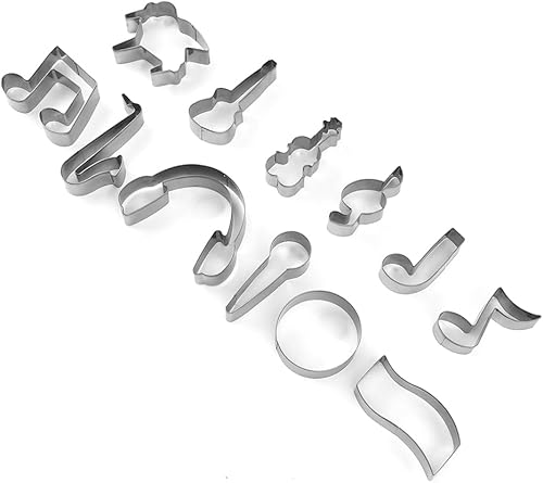 Lot de 12 emporte-pièces musicaux en acier inoxydable – Différentes formes dont partitions, guitare et casque