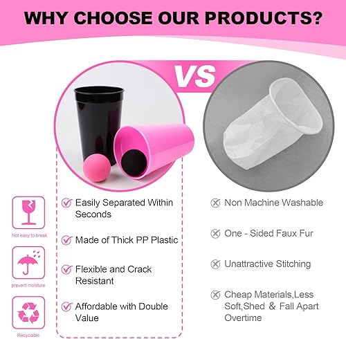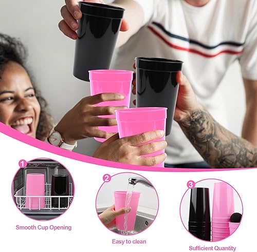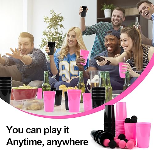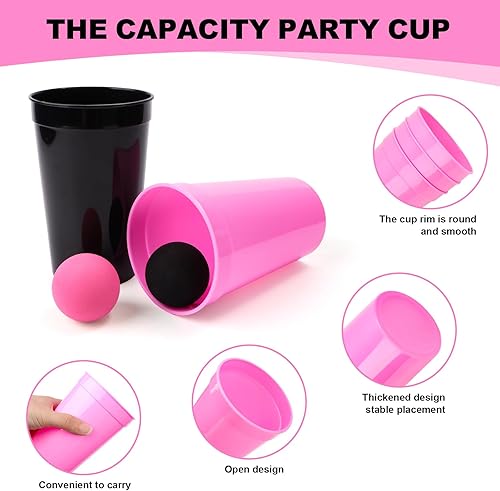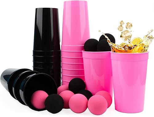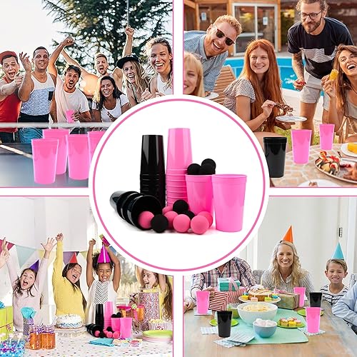 Lot de 34 gobelets à bière pong - 22 gobelets et 12 balles - Noir et rose - Réutilisables - 700 ml - En plastique dur - Pour anniversaire, mariage, pique-nique, fête en famille