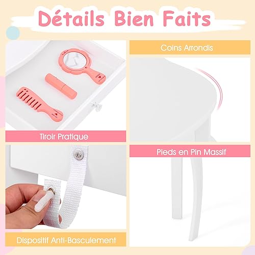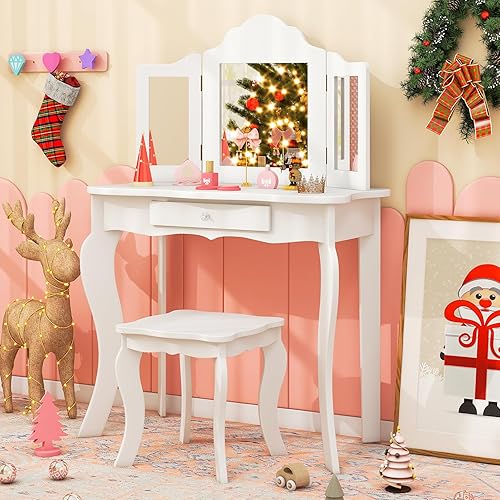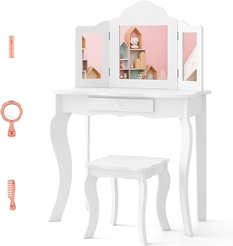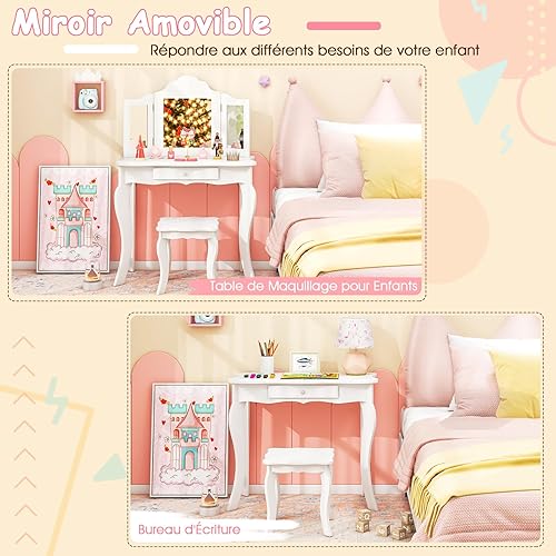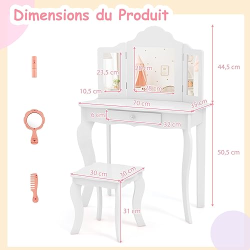 COSTWAY Coiffeuse et Tabouret pour Enfants, avec Miroir à 3Panneaux et Tiroir, Coiffeuse Amovible 2 en 1, Meuble MDF, 70 x 34 x 104 CM, Rose (Blanc)