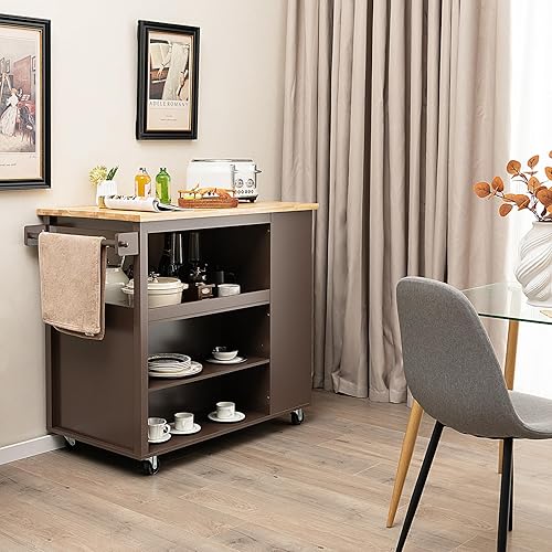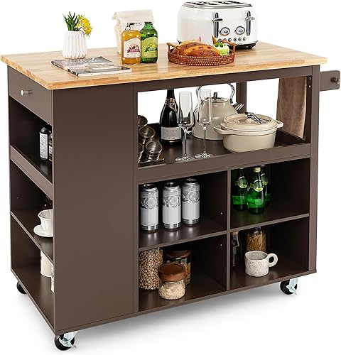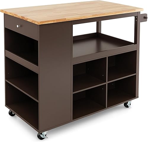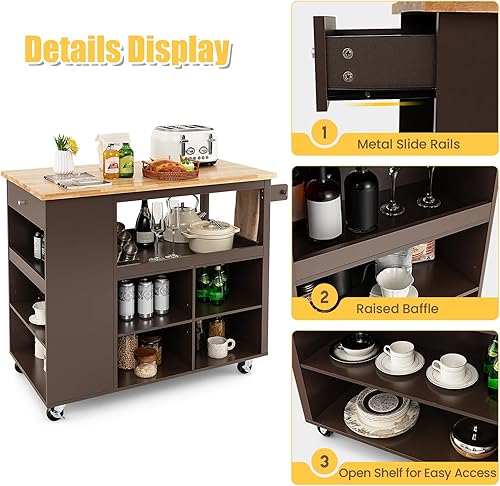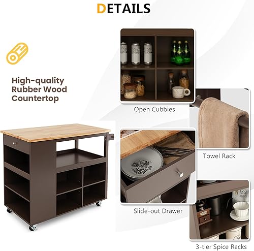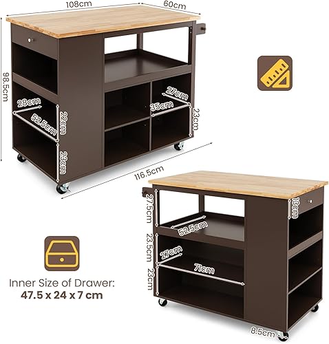 KOMFOTTEU Chariot de cuisine avec roues, île de cuisine en bois avec 8 compartiments, étage, tiroir, porte-serviettes, chariot de service multifonctionnel, 116,5 x 60 x 98,5 cm (marron)