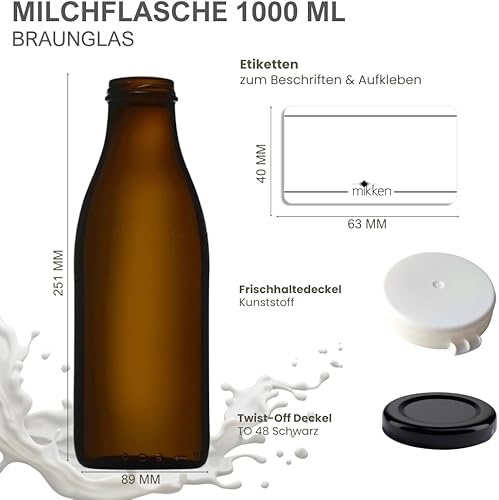 mikken 4 bouteilles en verre marron de 1 litre avec bouchon à visser, 4 couvercles fraîcheur et étiquettes