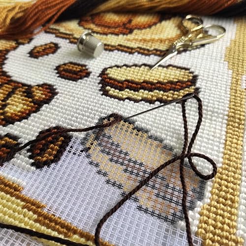 Kit de point d'aiguille à café pour adultes et débutants — Petit déjeuner à Paris 40,6 x 40,6 cm avec motif imprimé clair et précis sur toile de coton; comprend 2 aiguilles, fil et tableau facile à