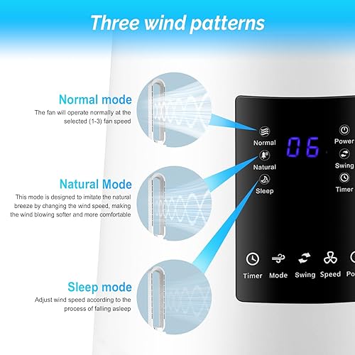 Ventilateur colonne,ventilateur colonne silencieux, mode 3 vitesses 3 vents, télécommande, 80 W, minuterie de 8 heures, balançoire à 60°,ventilateur colonne pour salon et chambre