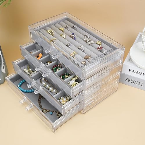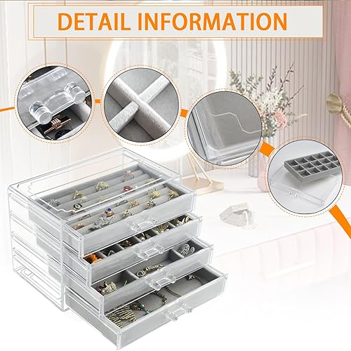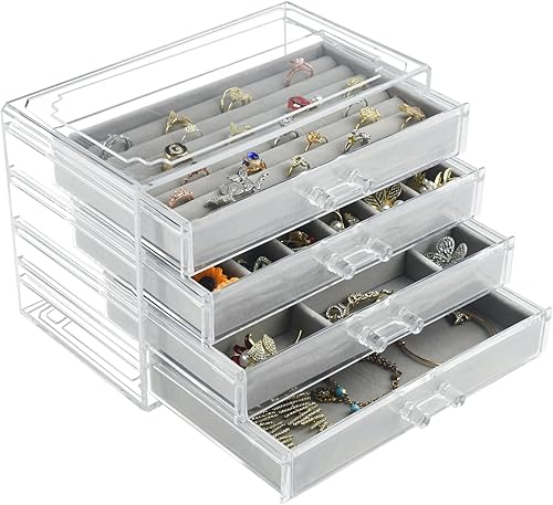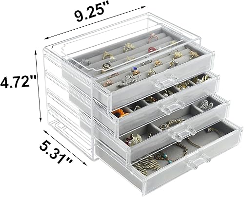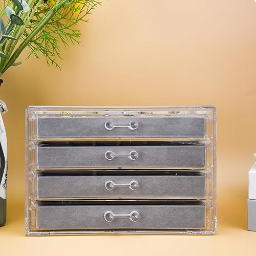 Weiai Organisateur de bijoux en acrylique, boîte à bijoux transparente avec 4 tiroirs, étui de rangement pour femme (gris)