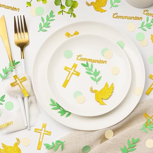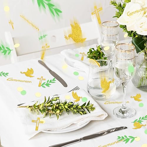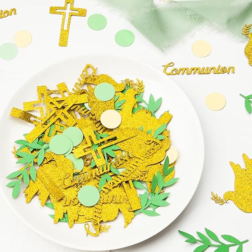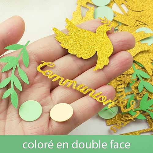 100Pcs Confettis Communion Vert Doré Motif Pigeon Croix Décoration Table Confettis en Papier pour Fête Garçon Flle